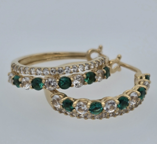 Estas arracadas dobles cuentan con un diseño moderno que combina esmeraldas y zafiros blancos creados en laboratorio. Su estructura bañada en oro de 14k sobre plata aporta un brillo cálido y elegante.