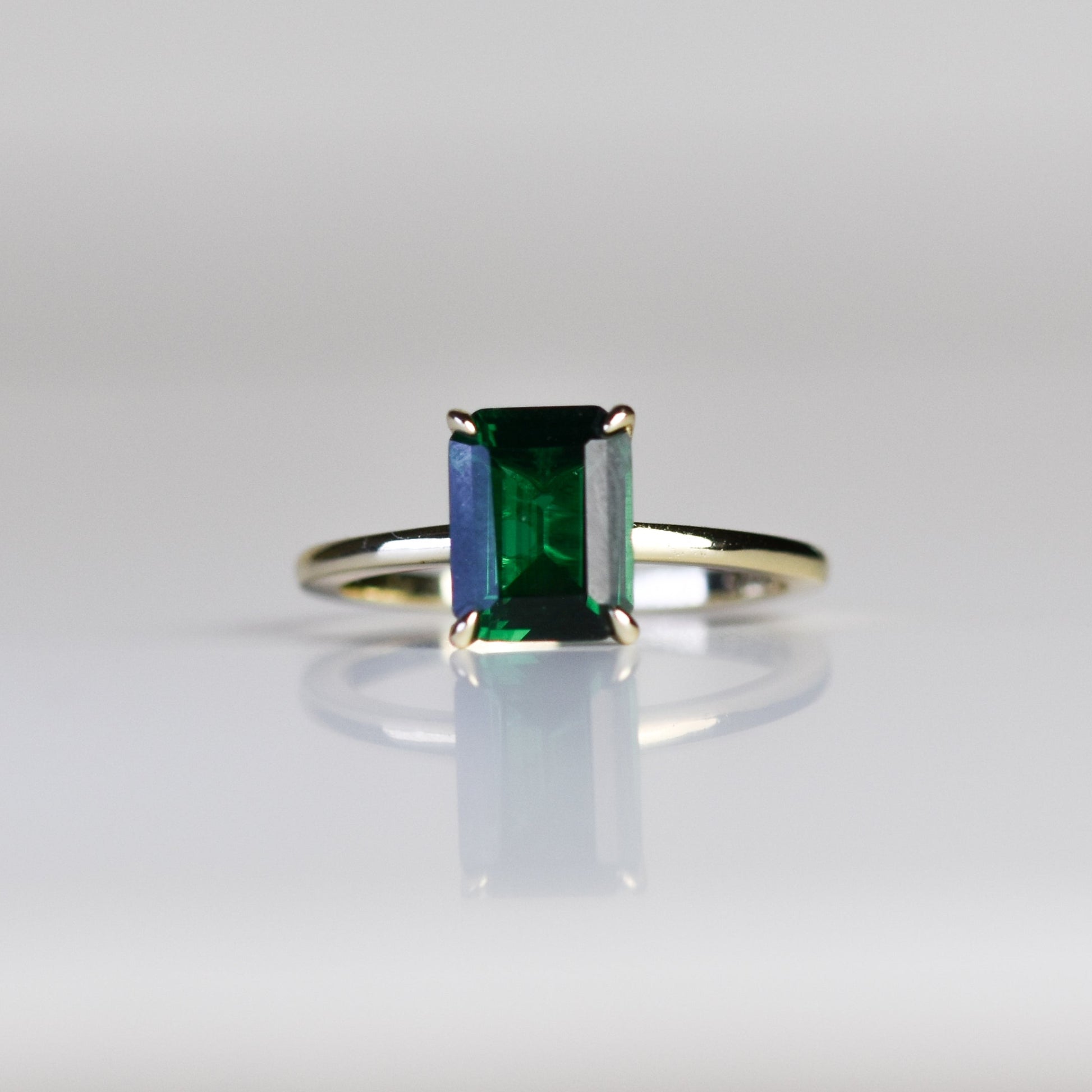 Un diseño elegante y moderno que resalta por su piedra central: una esmeralda de laboratorio de 3 quilates con corte esmeralda, montada sobre plata esterlina .925 y bañada en oro de 14 quilates.