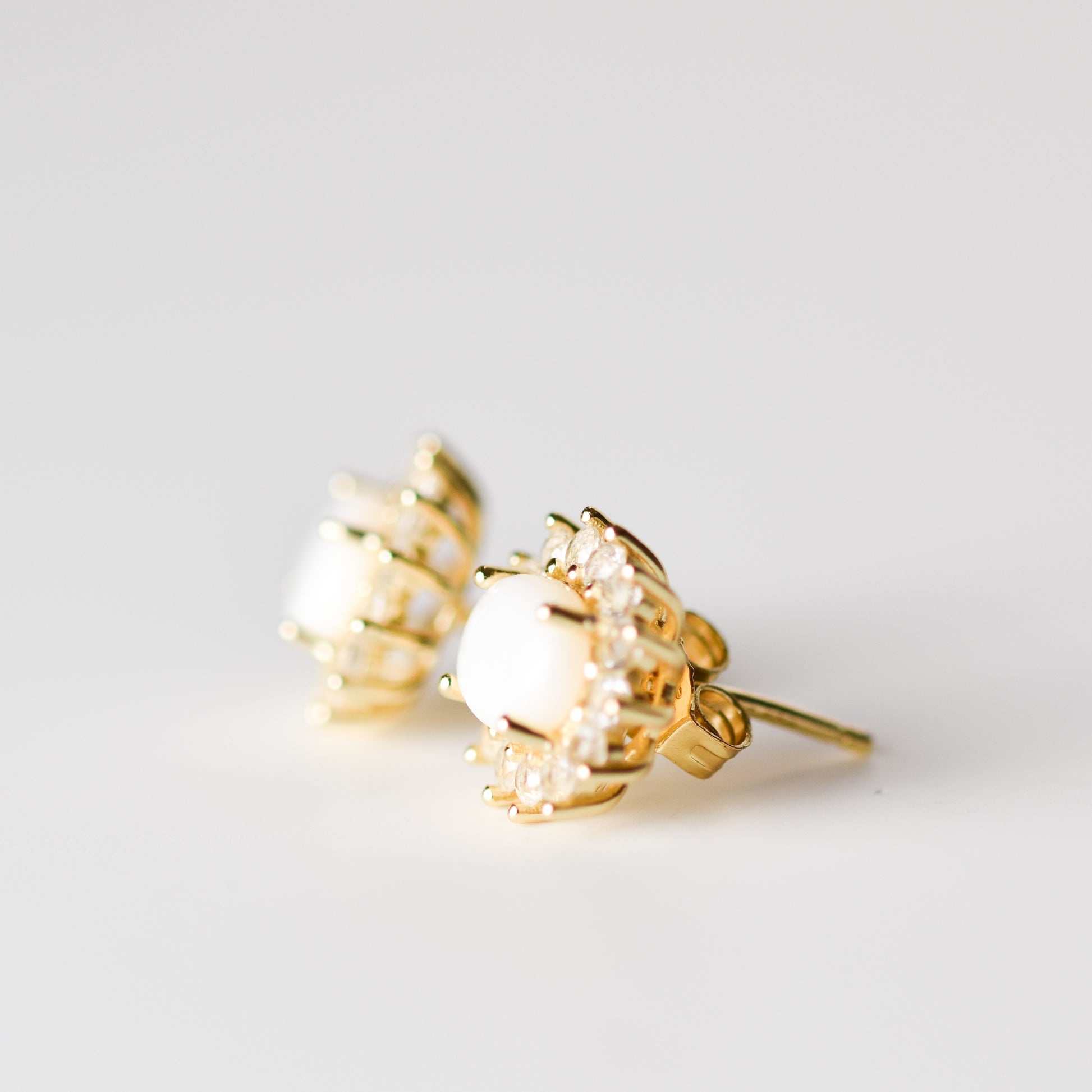 Estos aretes combinan el ópalo natural con la pureza del topacio blanco, creando una pieza luminosa y sofisticada. Su diseño radiante en forma de sol los convierte en un accesorio que enmarca el rostro con elegancia sutil. El montaje en plata con baño de oro resalta el contraste entre las gemas, añadiendo un toque cálido y refinado.