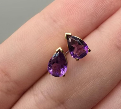 Aretes tipo stud con amatista en forma de gota y oro amarillo de 14K