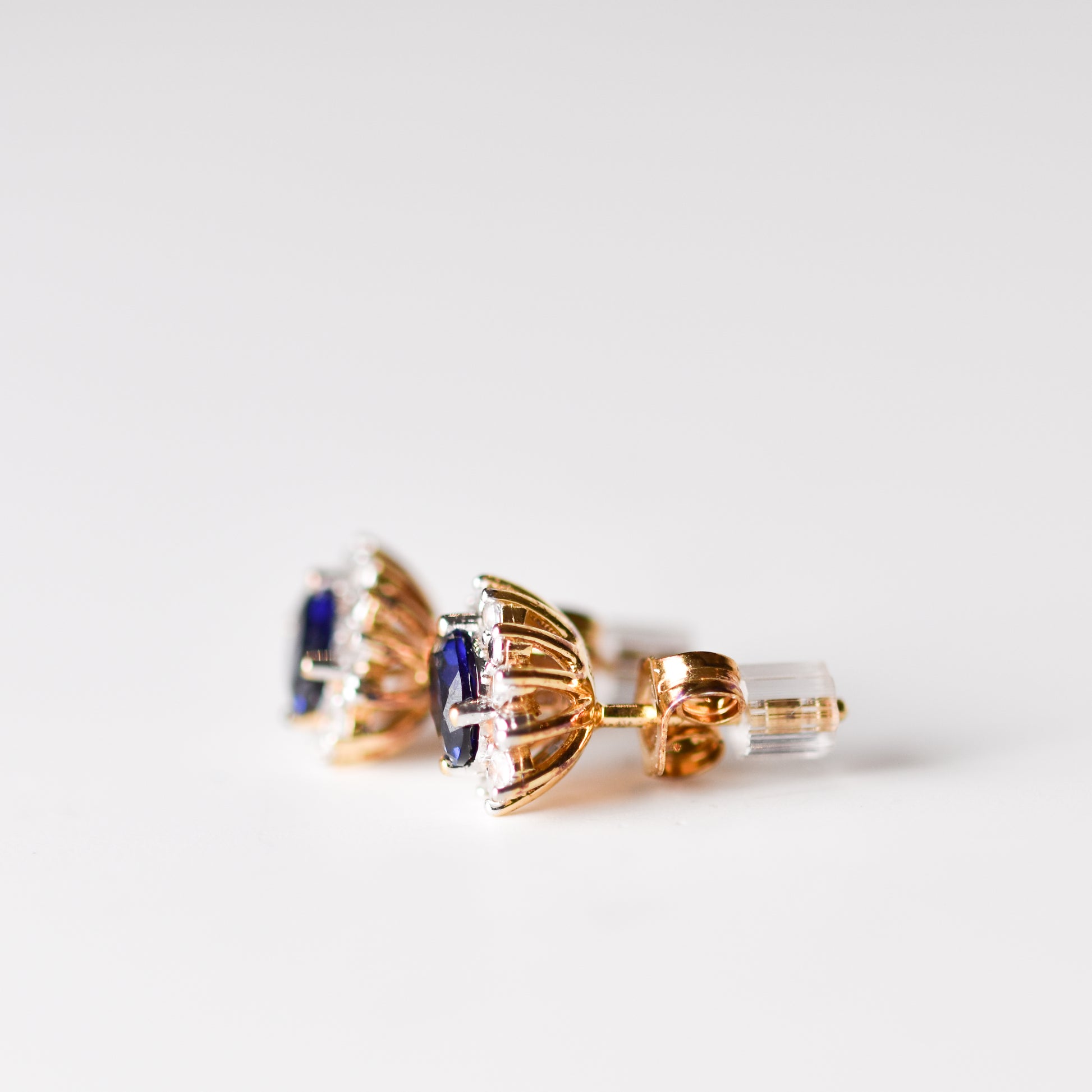 Aretes tipo stud con zafiro azul y zafiro blanco en plata con baño de oro
