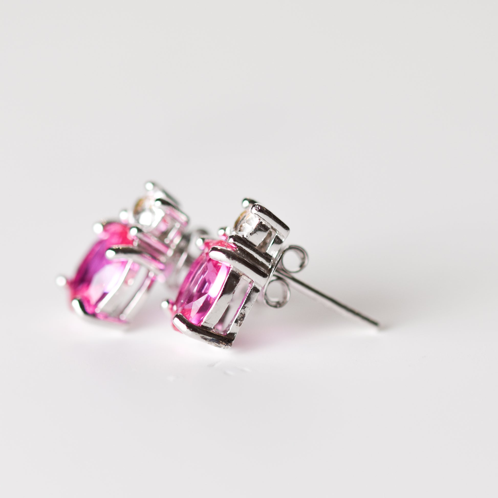 Con un vibrante zafiro rosa ovalado acompañado de un zafiro blanco en la parte superior, estos aretes ofrecen una combinación de energía y brillo sobre plata esterlina. Ideal para quienes aman el color y el estilo único.