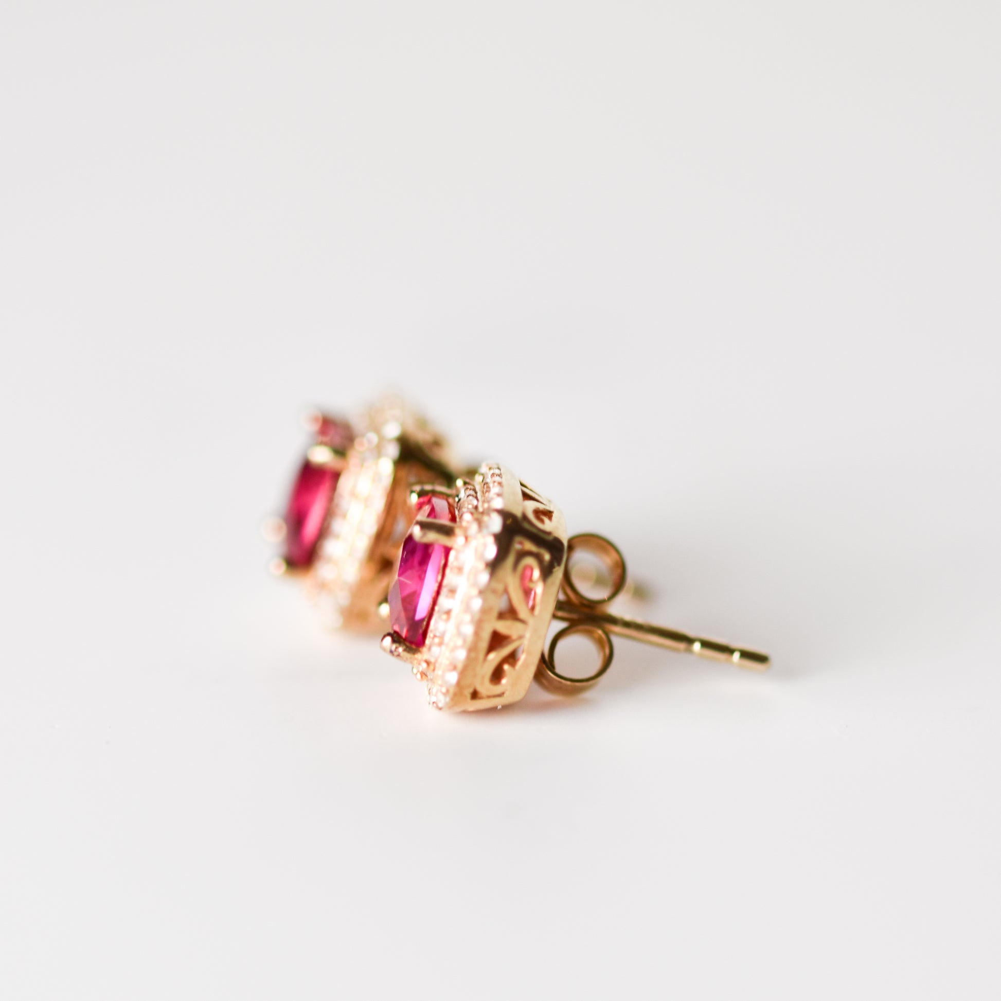 Aretes tipo stud cuadrados con rubí (2.05 ct) y halo de zafiros blancos