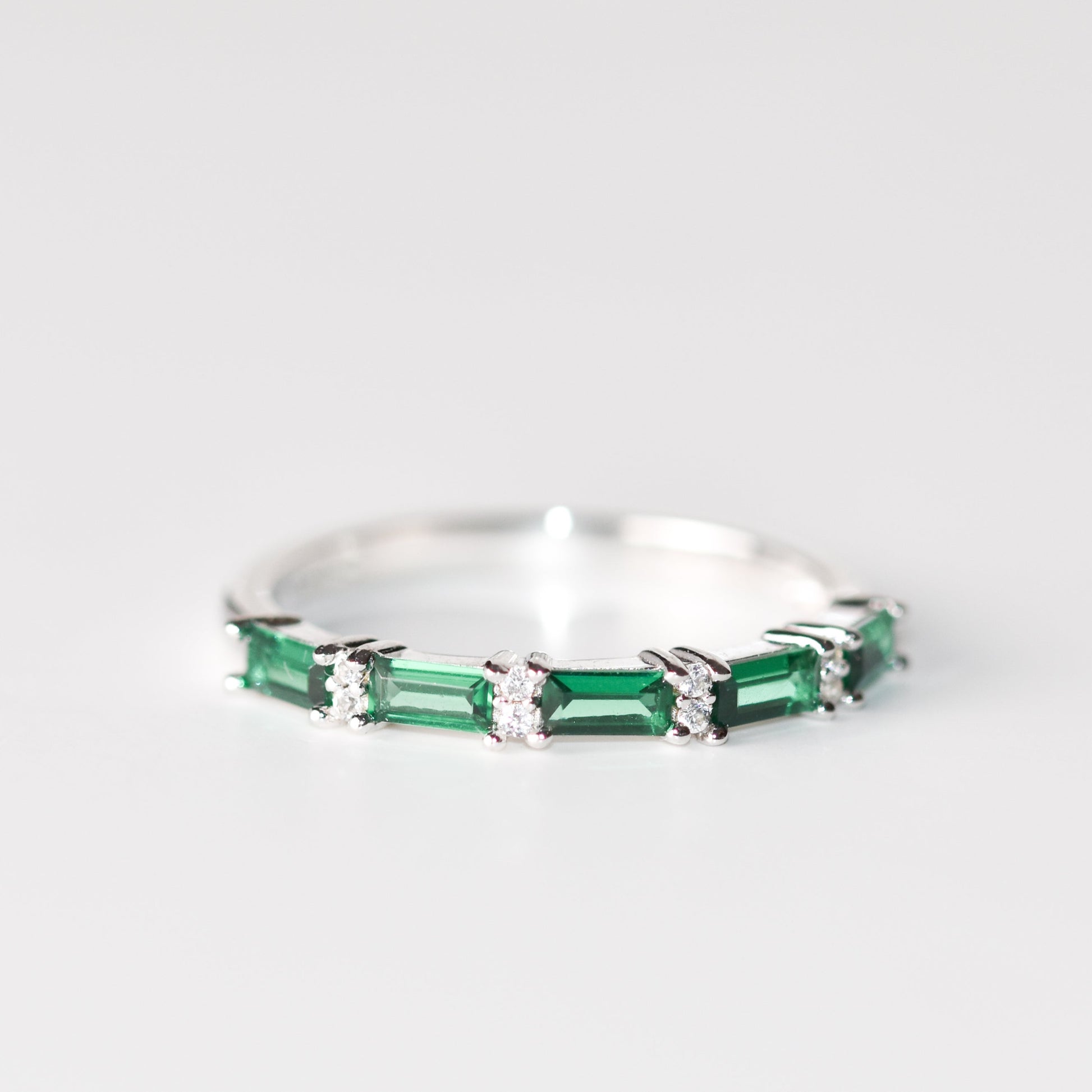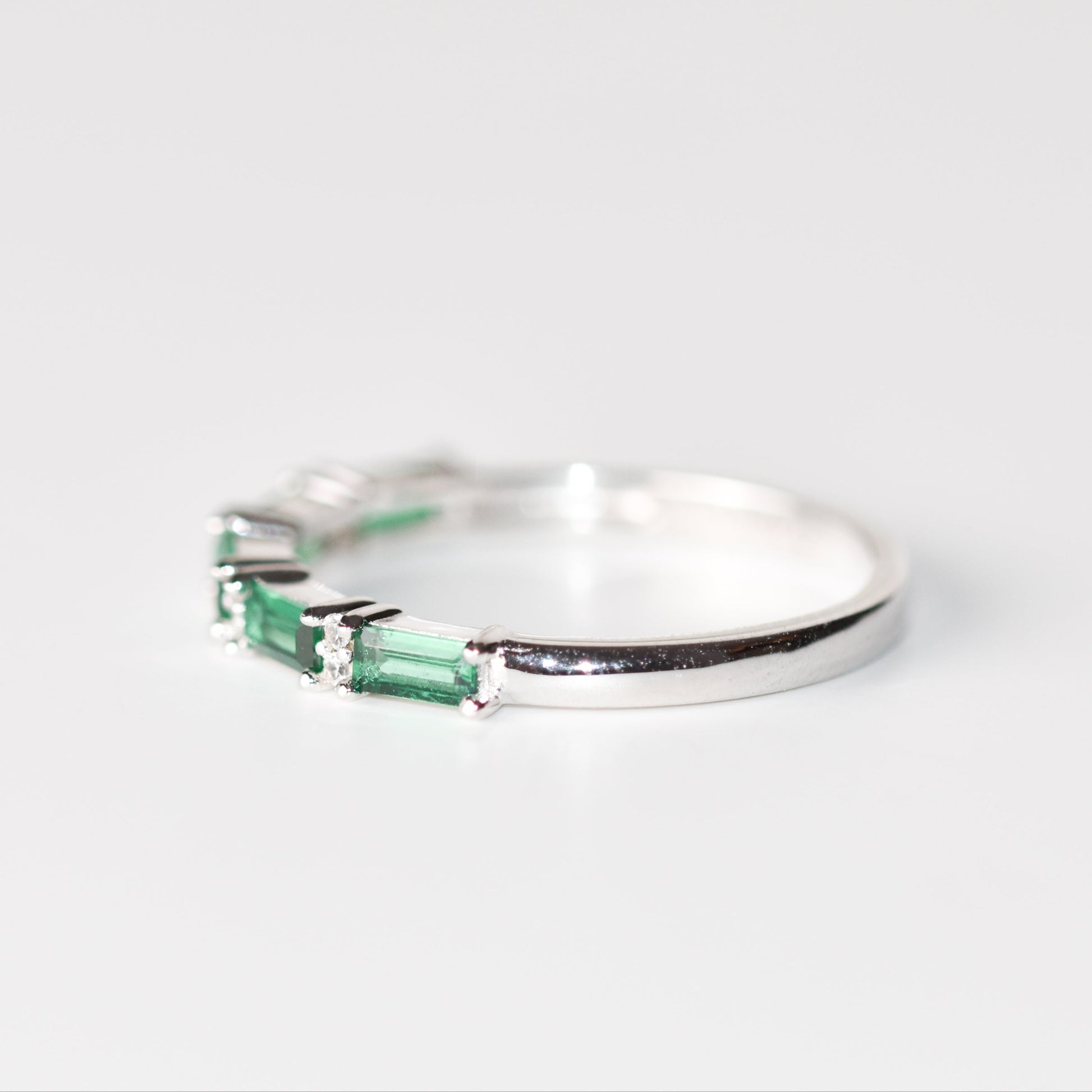 Esta churumbela alterna esmeraldas y zafiros blancos de laboratorio en un diseño fino y elegante. Montada sobre una base de plata esterlina, es una pieza ideal para uso diario, regalos especiales o para apilar con otros anillos.