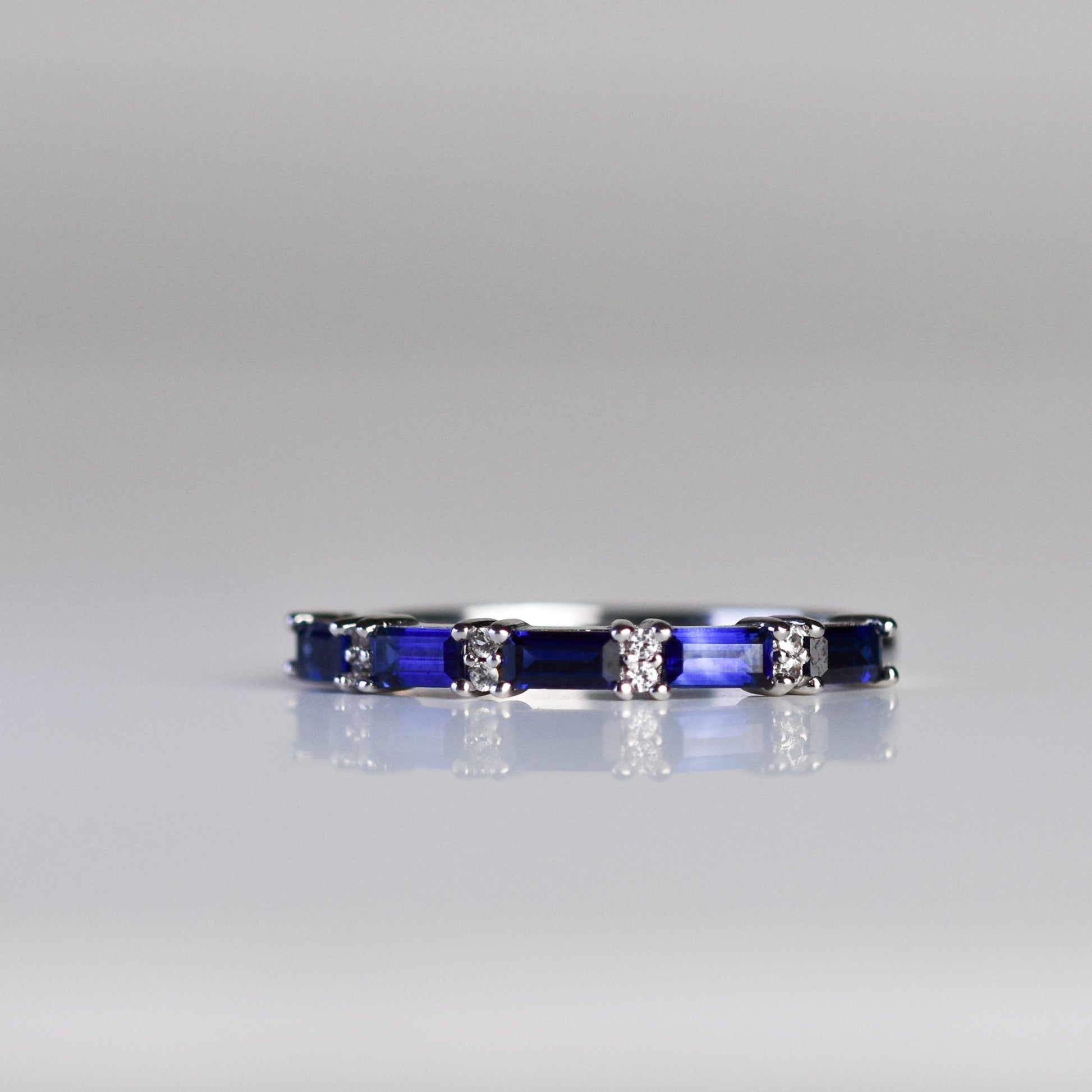 Una churumbela refinada con un toque de intensidad: los zafiros azules de laboratorio se alternan con zafiros blancos sobre un aro de metal plateado, logrando un equilibrio visual elegante y moderno.