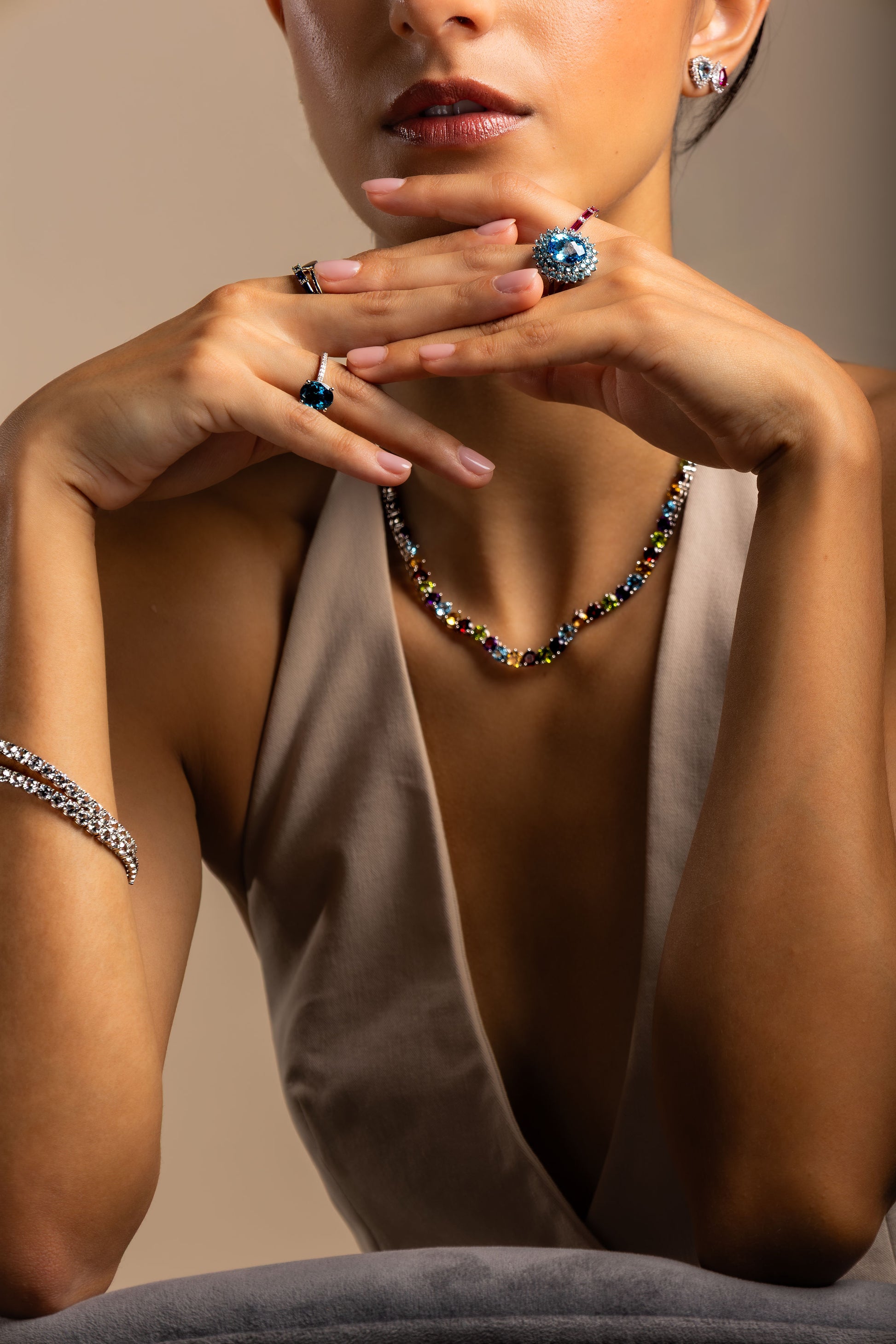 Usamos amatistas, citrinos, cuarzos y topacios naturales, así como gemas de laboratorio como zafiros y esmeraldas, todas con certificación.
