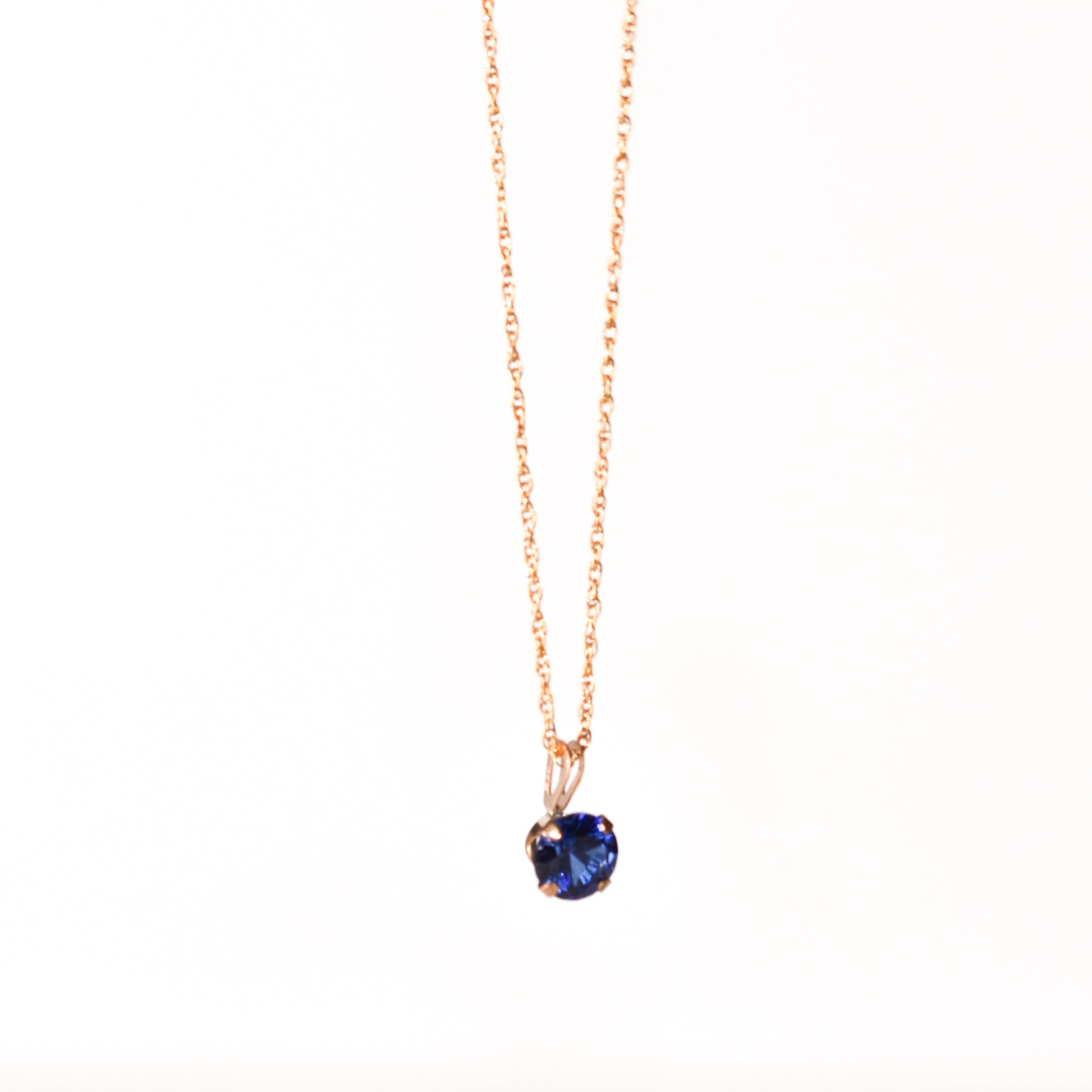 Dije solitario redondo de zafiro (6mm) creado en laboratorio Oro 10k con cadena 14k Gold Filled