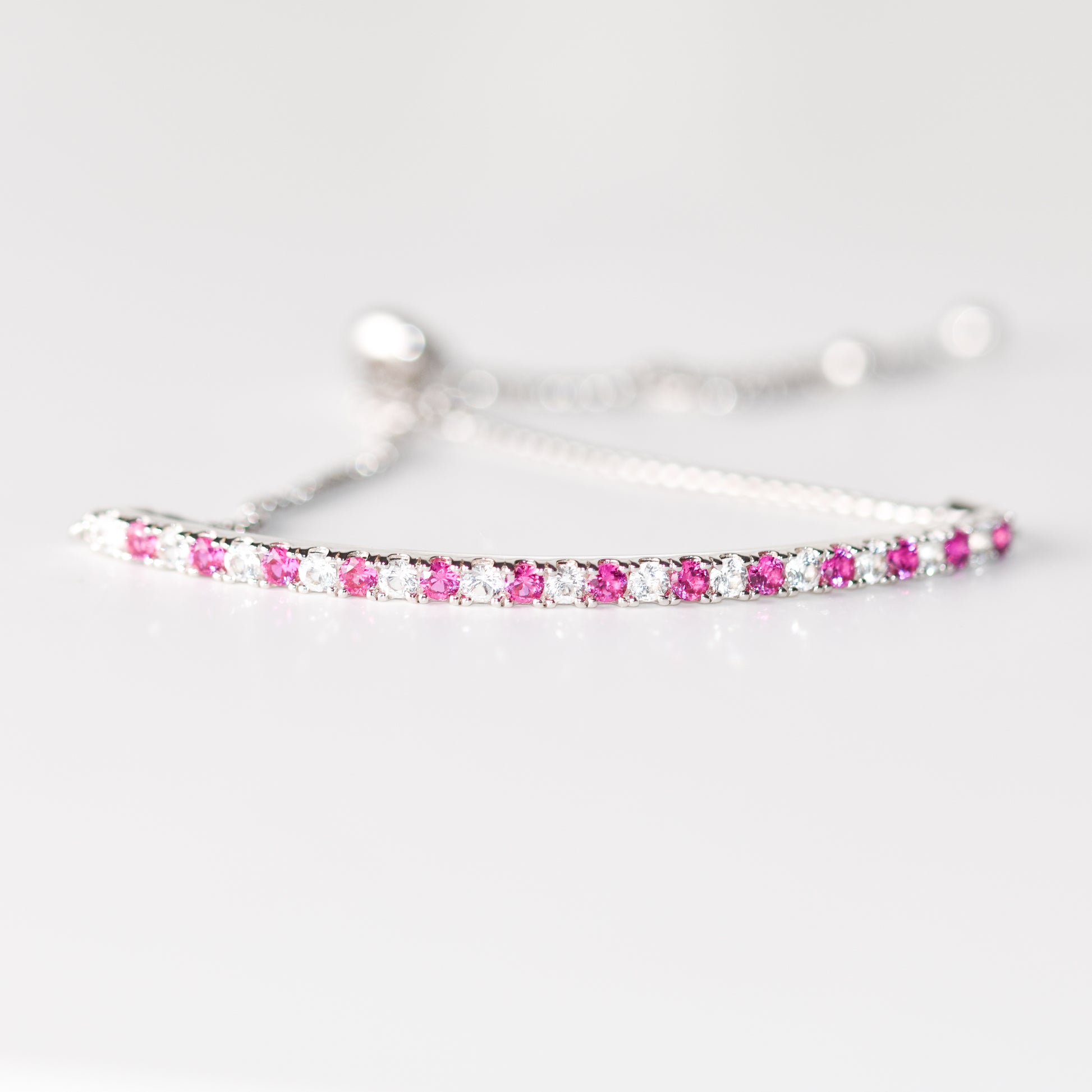Diseño ajustable tipo bolo con una fila de rubíes vibrantes, acompañados de zafiros blancos creados en laboratorio. Montada en plata esterlina, ofrece una combinación perfecta de color, brillo y comodidad.